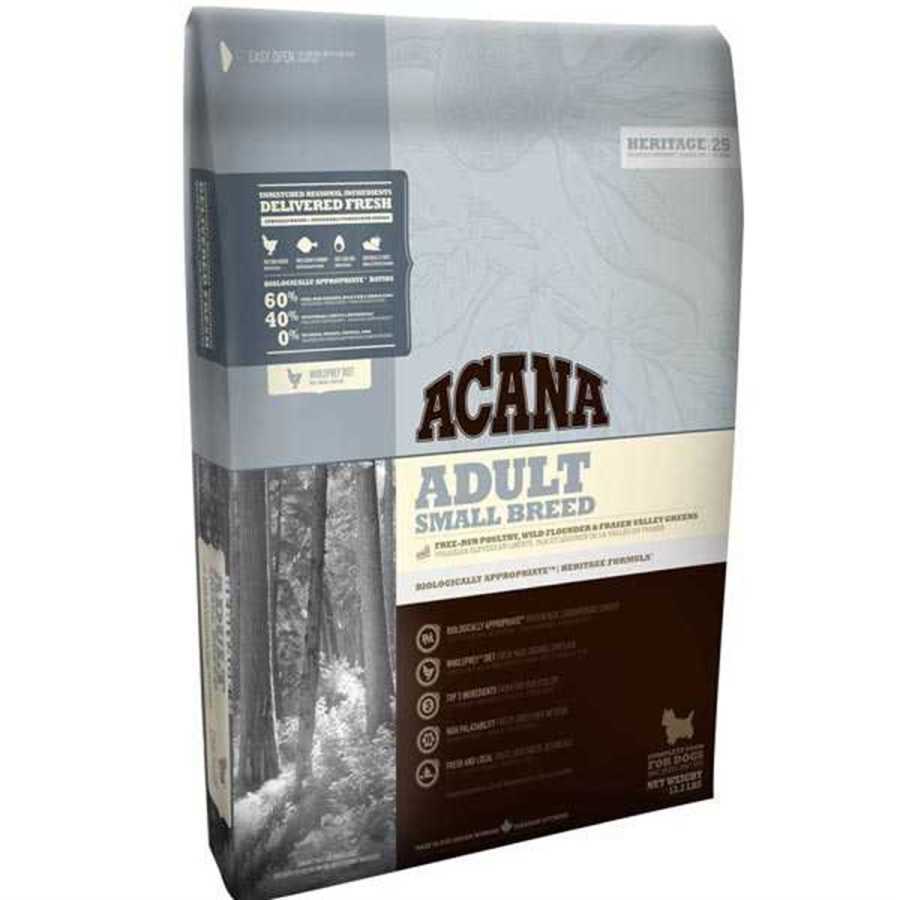 Acana Tahılsız Tavuklu Balıklı Küçük Irk Köpek Maması, Küçük ırk köpeklerin günlük besin ihtiyaçlarını karşılamda et beslenmesine yoğunlaşan Acana Adult Small Breed yüksek kaliteli proteinler ve yağlar içerir. Günlük enerji ihtiyaçları yüksek olan küçük ırk köpeklerde obeziteye karşı önlem olarak düşük karbonhidrat oranı içeren Acana Adult Small Breed'in içeriğinin %60'ı et ürünlerinden oluşmaktadır. Acana firması kendi yerel çiftliklerinden aldığı yumurta ve günlük taze elde edilen dondurulmayan hiç bir koruyucu katkı maddesi içermeyen dil balığı içerir. Küçük ırk köpeklerin metabolizmalarına uygun yüksek oranda protein ve orta seviyede yağ içerir. Acana Adult Small Breed alerjik etkisi olması muhtemel mısır, luten ve buğday ürünleri içermez. Formülünde küçük ırk köpeklerin kilo almalarına sebep olan basit şeker içeriklerini barındırmayan mama bunların yerine basit şekerleri içermeyen, düşük glisemik karbonhidrat olan yulaf içerir.