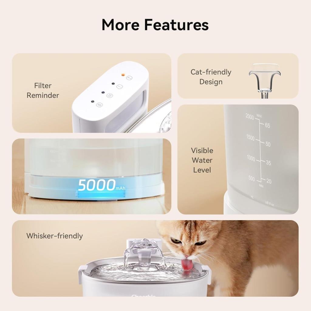 Cheerble E1+ Çelik Hazneli Şarjlı Otomatik Kedi Su Pınarı, Cheerble E1+, kedinizin günlük su tüketimini artırmak ve sağlıklı bir yaşam tarzını desteklemek için tasarlanmış modern ve şık bir otomatik su pınarıdır. Paslanmaz çelik haznesi ve şarjlı tasarımı sayesinde hem hijyenik hem de kullanımı kolay bir çözümdür. Şık ve Kompakt Tasarım: 22 x 20 x 18 cm boyutlarıyla her ortama kolayca uyum sağlar.