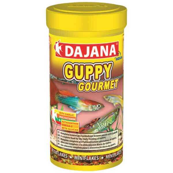 Dajana Guppy Gourmet Flakes, Balıklarınızın sağlıklı bir şekilde büyümesi için gerekli olan sarımsak (yüksek oranda), protein, vitamin ve mineralleri içermektedir. Kolayca yenilen ve sindirilen bu yem hızlı bir şekilde balığınızın günlük yemi haline gelecektir. Yem içeriği;Bitkisel protein konsantreleri,kabuk,yosun,balık ve balık ürünleri,tahıl,kuru maya,sarımsak,spirulina yosunu,yağ,lesitin, antioksidan.