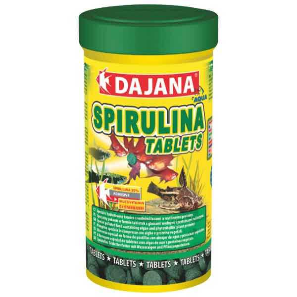Dajana Mini Spirulina Wafers, Akvaryum tabanında yaşayan dipten beslenen balıklar için yüksek Spirulina içeriğine sahip yemdir.