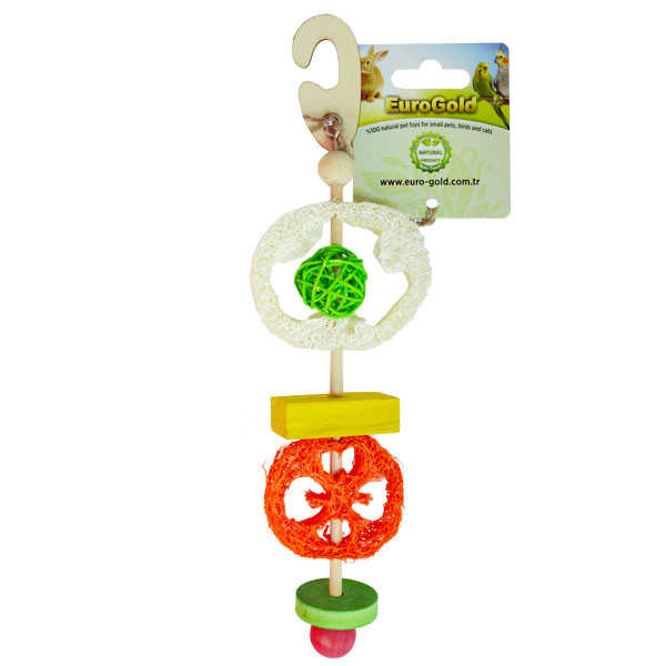 EuroGold Askılı Kuş-kem Oyuncak Lifli Meyve Dilimi ve Toplar Oyuncak, askılı sıralı ahşap lifli toplar kuş oyuncağıdır. Kaliteli malzemeden yapılmış iplere renkli liflerle eklenmiş daha da fazla oynaması için tasarlanmış kuş oyuncağıdır. Kuşumuz kafes içerisinde renkli toplar ile daha güzel zaman geçirecektir. Asmalı oyuncak şekli sayesinde kuşunuzun dikkatini kolaylıkla çekecektir. Böylelikle kafesine daha kolay alışacaktır.