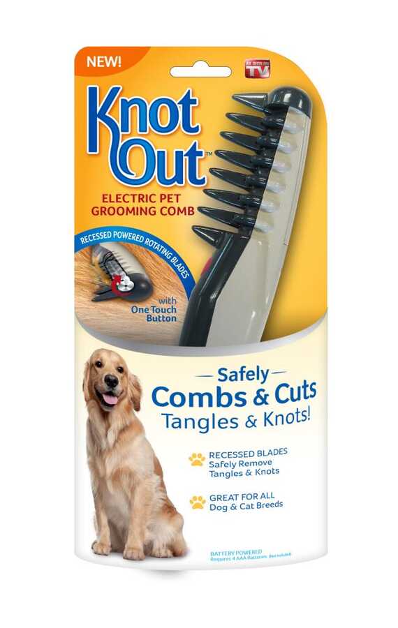 Knot Out Kedi ve Köpek İçin Pilli Döner Jiletli Kıtık Açıcı Tarak, uzun ve yoğun tüy yapısına sahip kedi ve köpekler için, bakımsız, karışmış ve kıtıklaşmış tüylerin taranmasını kolaylaştıran, iç kısımda bulunan jiletler ile tarakta bulunan düğmeye basarak harekete geçiren mekanizma ile kıtıkların açılmasını kolaylaştıran döner jilet sistemi ile 23 cm uzunluğunda köpek tüy bakım tarağı.