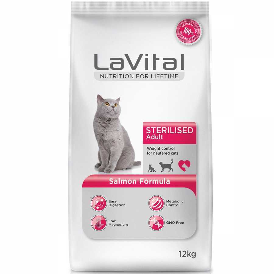 La Vital Somonlu Kısırlaştırılmış Kedi Maması, Kısırlaştırılmış yetişkin (+1) kediler için kedi maması.Kısırlaştırılmanın ardından hormon dengesi değişen kedilerde iştah artışı ve beraberinde kilo alımı görülebilir. Bunun önüne geçmek için kedilerin beslenmeleri kilo kontrolü sağlanacak şekilde tekrar düzenlenmelidir. Ayrıca bu süreçte böbrek sağlığına daha fazla özen göstermek gerektiğinden, besinlerin mineral içeriklerine dikkat edilmelidir. Lavital Kısırlaştırılmış kedi maması, 12 ay üzeri kısırlaştırılmış kediler için ideal bakım sağlamak için özel olarak formüle edilmiştir. Bu besleyici ve dengeli özel formül, kısırlaştırılmış kedilerde ideal kilonun korunmasına yardımcı olur.Kolay sindirilir.Kaliteli ve sindirim oranı yüksek içerikle formüle edilmiştir.Bağırsak aktivitesini destekleyen bir prebiyotik olan frukto-oligosakkarit içerir.Metabolik Kontrol Düşük kalorili formül, kısırlaştırılmış kedilerde ideal vücut kondisyonunun sürdürülmesini sağlar.Düşük Magnezyum Seviyesi Böbrek hastalıklarını önlemek için, kaliteli içerik ve düşük magnezyum ile formüle edilmiştir.GDO İçermez Seçilen içerik genetiği değiştirilmiş organizma içermez. (*)AB mevzuatına göre