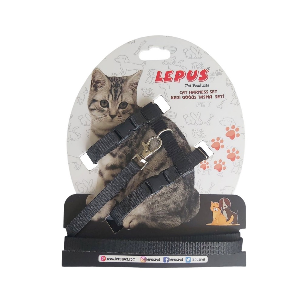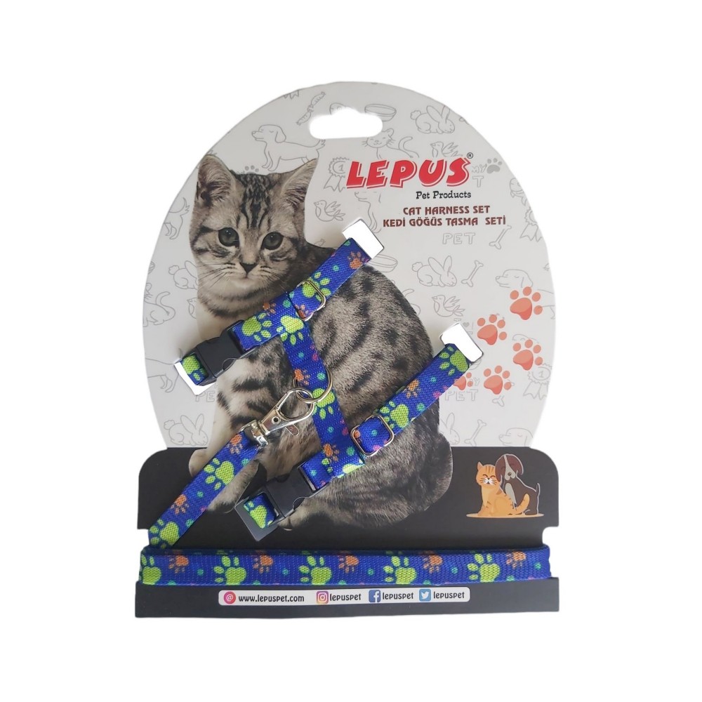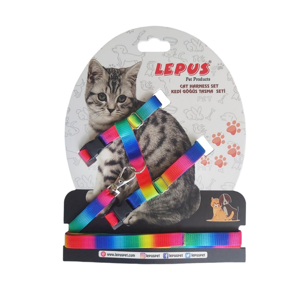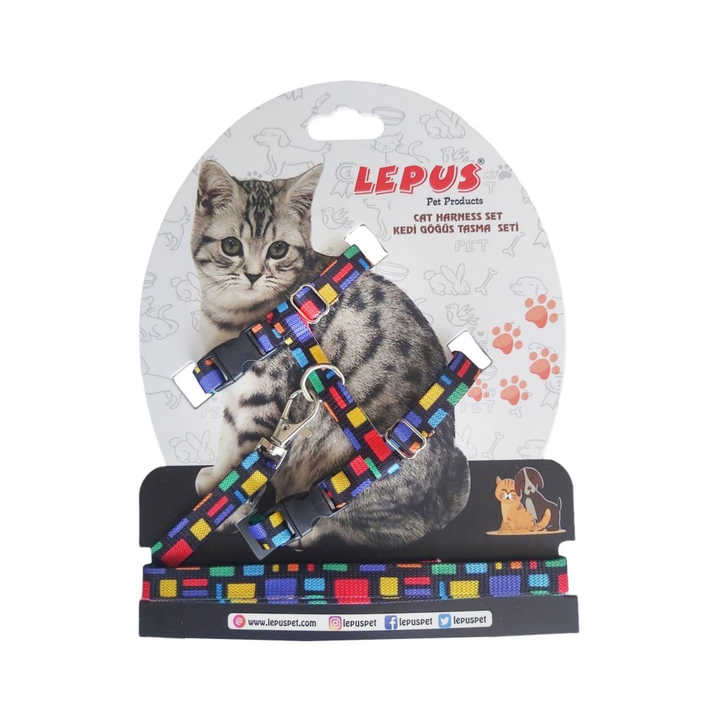 Lepus Kedi Göğüs Tasması Karışık Renkli, Kediler için, göğüs ve boyun genişliği istenilen ölçüde ayarlanabilen, 1 cm eninde, 120 cm uzunluğunda gezdirme tasması bulunan, naylon dokumalı, göğüs ve gezdirme tasma takımıdır.