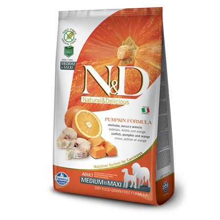 N&D Balkabaklı Morina Balıklı Medium Maxi Tahılsız Köpek Maması, Codfish & Orange Adult, Morina balığı, bal kabağı ve portakal. Yetişkin köpekler için tam mamadır.