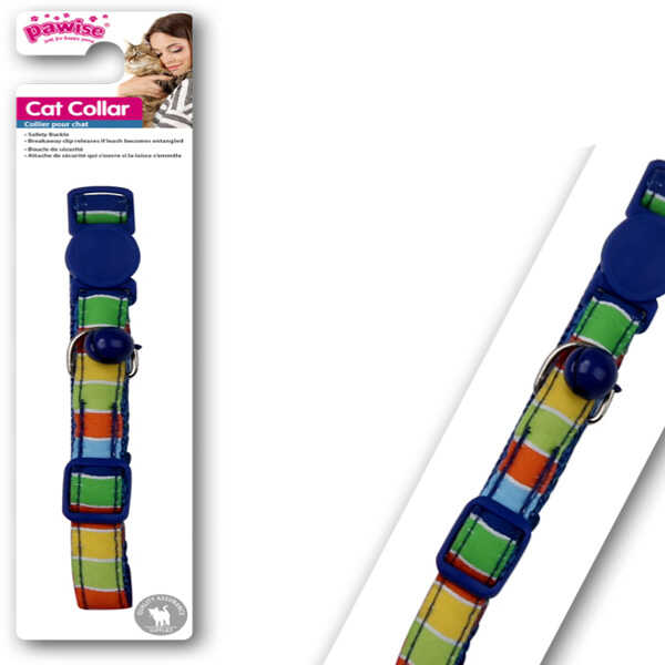 Pawise Mavi Şeritli Kedi Boyun Tasması, kediler için, plastik klipsli, naylon kumaştan yapılmış, kullanımı kolay, ayarlanabilen, çıngıraklı ve 1 x 28 cm ebatlarında kedi boyun tasmasıdır.