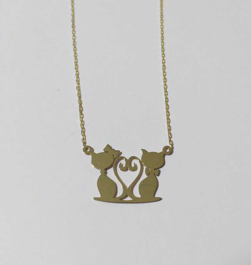 Petcanlar Kalpli Çiftli Kedi Gümüş Kolye Gold 925 Ayar