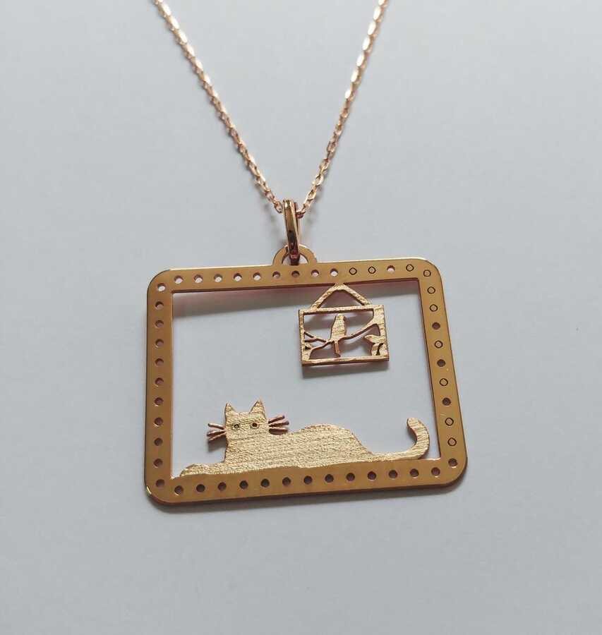 Petcanlar Kare İçinde Kedi ve Kuşlu Gümüş Kolye Rose 925 Ayar