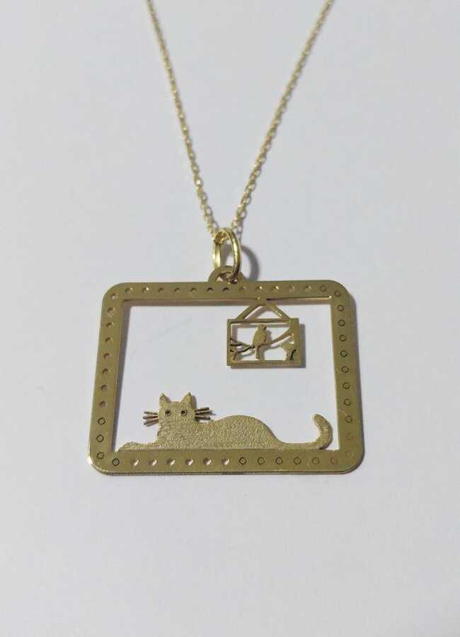 Petcanlar Kare İçinde Kedi ve Kuşlu Gümüş Kolye Gold 925 Ayar