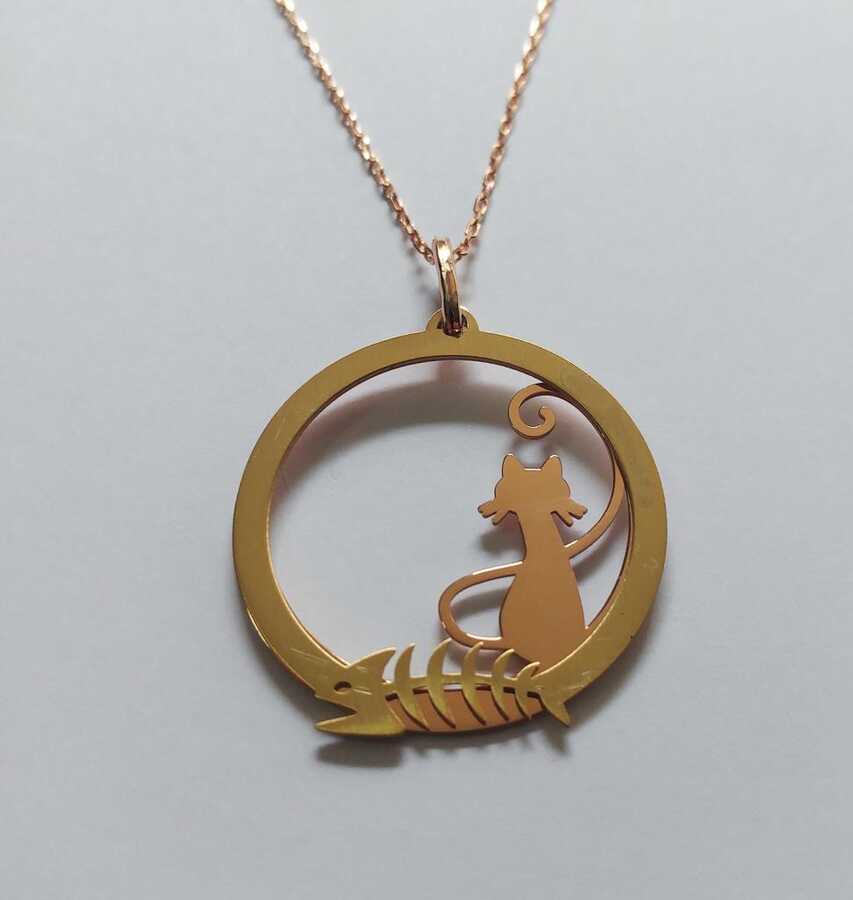 Petcanlar Yuvarlak İçinde Balıklı Kedi Gümüş Kolye Rose Gold 925 Ayar