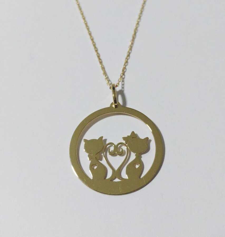 Petcanlar Yuvarlak İçinde Kalpli Kedi Gümüş Kolye Gold 925 Ayar