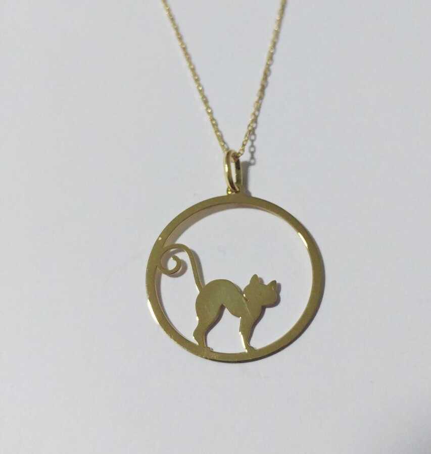 Petcanlar Yuvarlak İçinde Kedi Gümüş Kolye Gold 925 Ayar