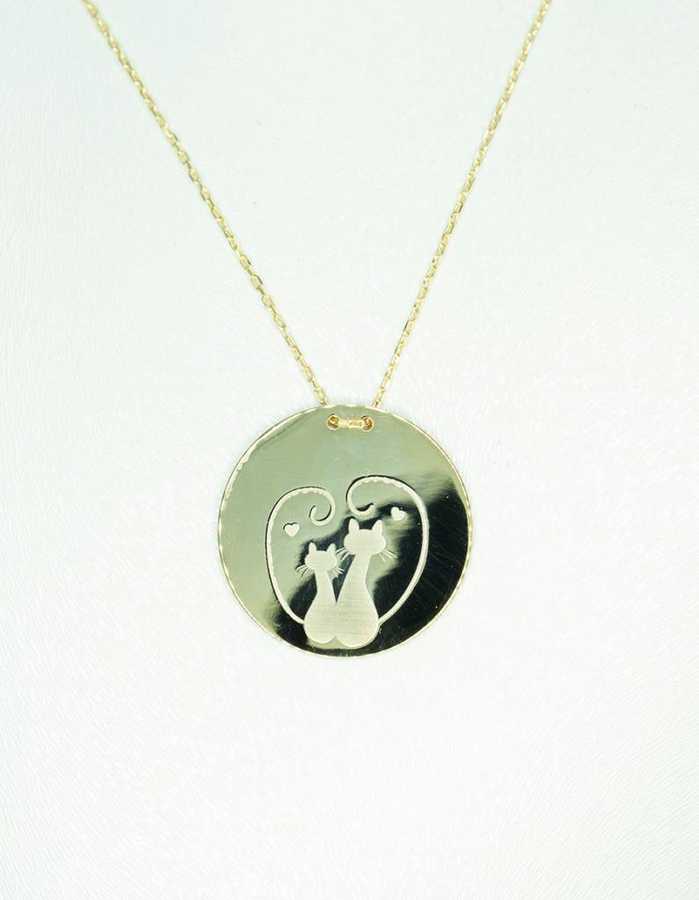 Petcanlar Yuvarlak Kalpli Kedi Gümüş Kolye Gold 925 Ayar