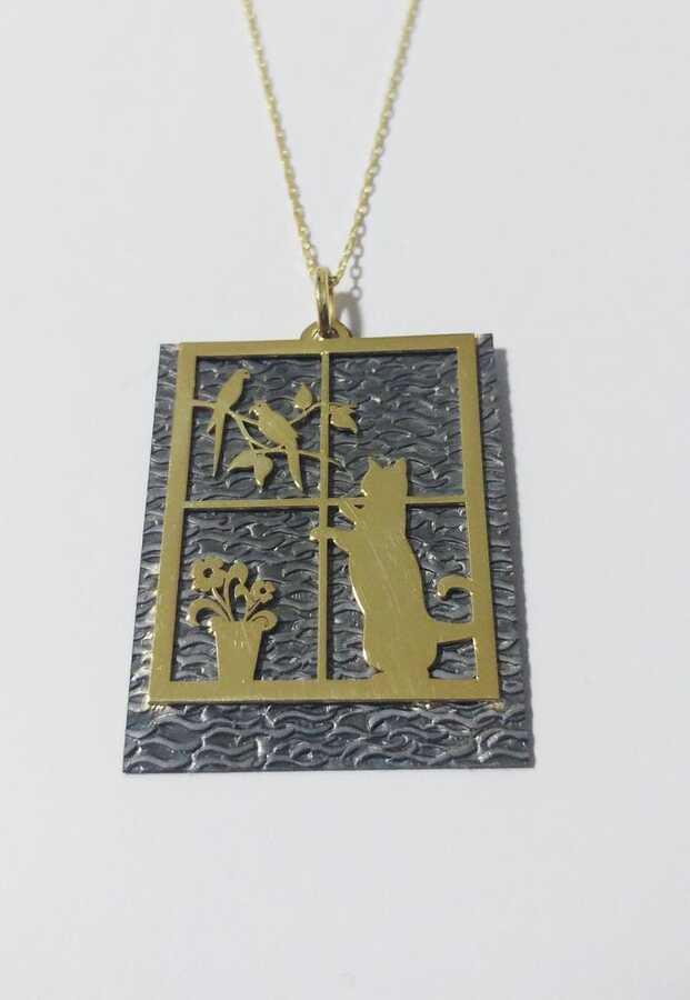 Petcanlar Zetina İşlemeli Kedili Kuşlu Gümüş Kolye Black Gold 925 Ayar