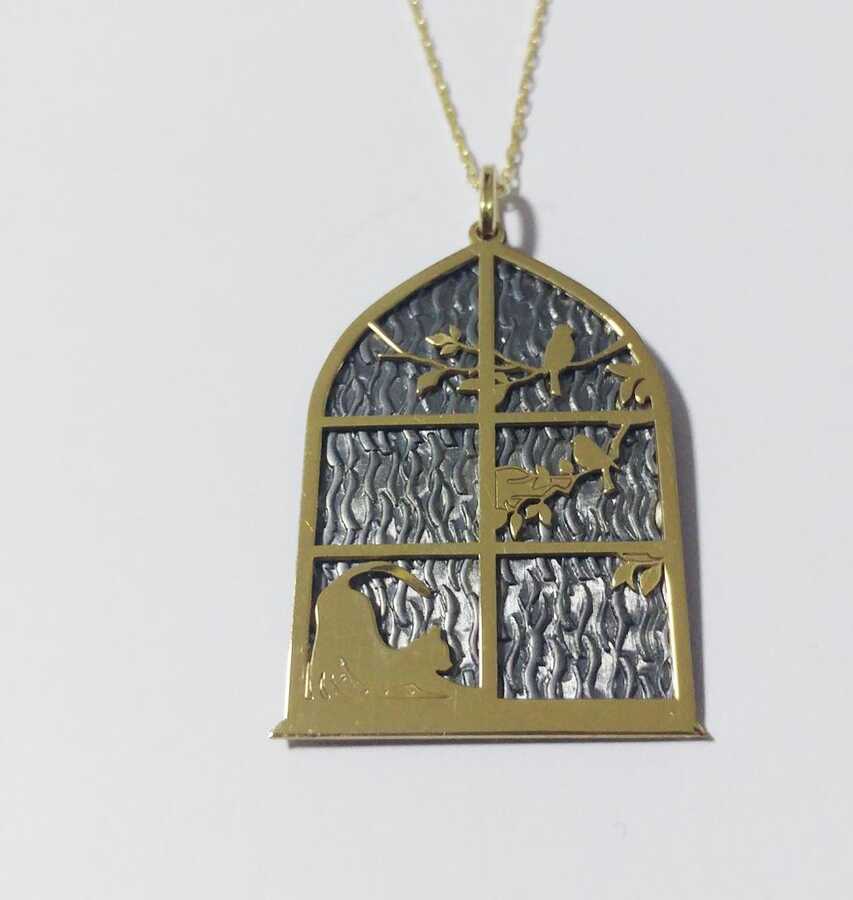 Petcanlar Zetina İşlemeli Kedili Kuşlu Gümüş Kolye Gold Black 925 Ayar