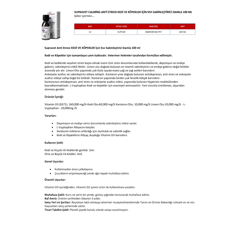 Supravet Calming Anti Stress Kedi ve Köpekler İçin Sıvı Sakinleştirici Damla