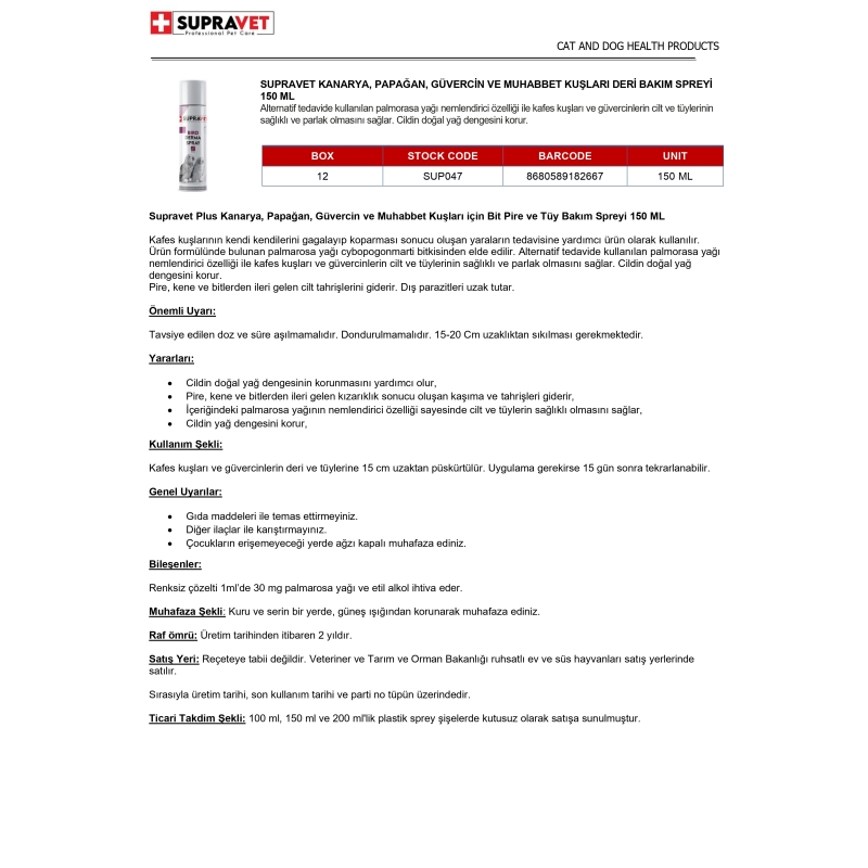 Supravet Kanarya, Papağan, Güvercin ve Muhabbet Kuşları Deri Bakım Spreyi 150 ml