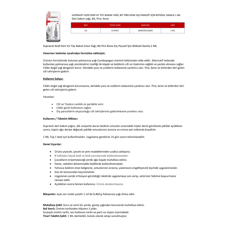 Supravet Kedi Deri Ve Tüy Bakım Yağı; Bit Pire Kene Dış Parazit Uzaklaştırıcı 1 ml
