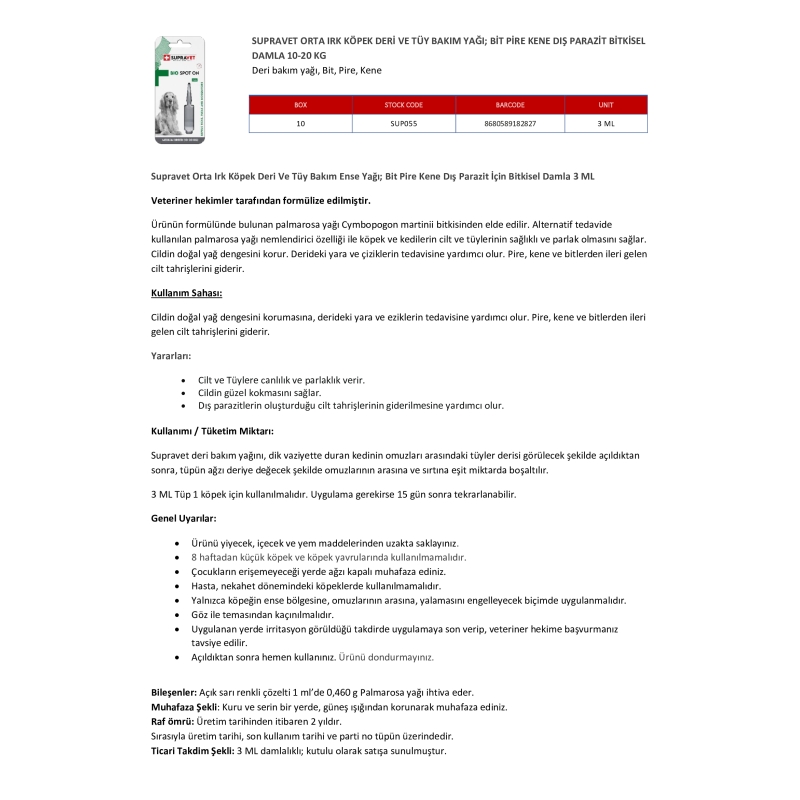 Supravet Orta Irk Köpek Deri Ve Tüy Bakım Ense Yağı Bit Pire Kene Dış Parazit Bitkisel Damla 3 ml