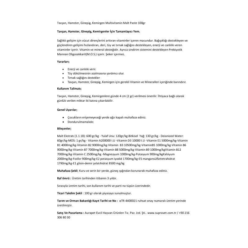 Supravet Tavşan Hamster Ginepig Kemirgen Multivitamin Malt Paste 100 Gr